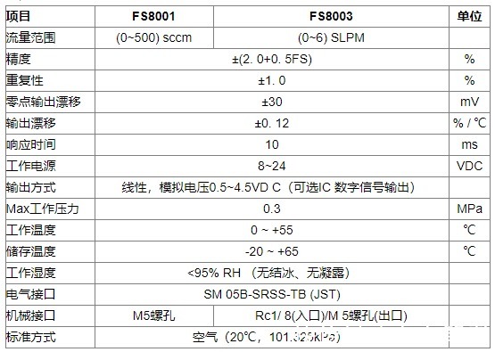 FS8000系列微机电气体质量流量传感器技术参数: